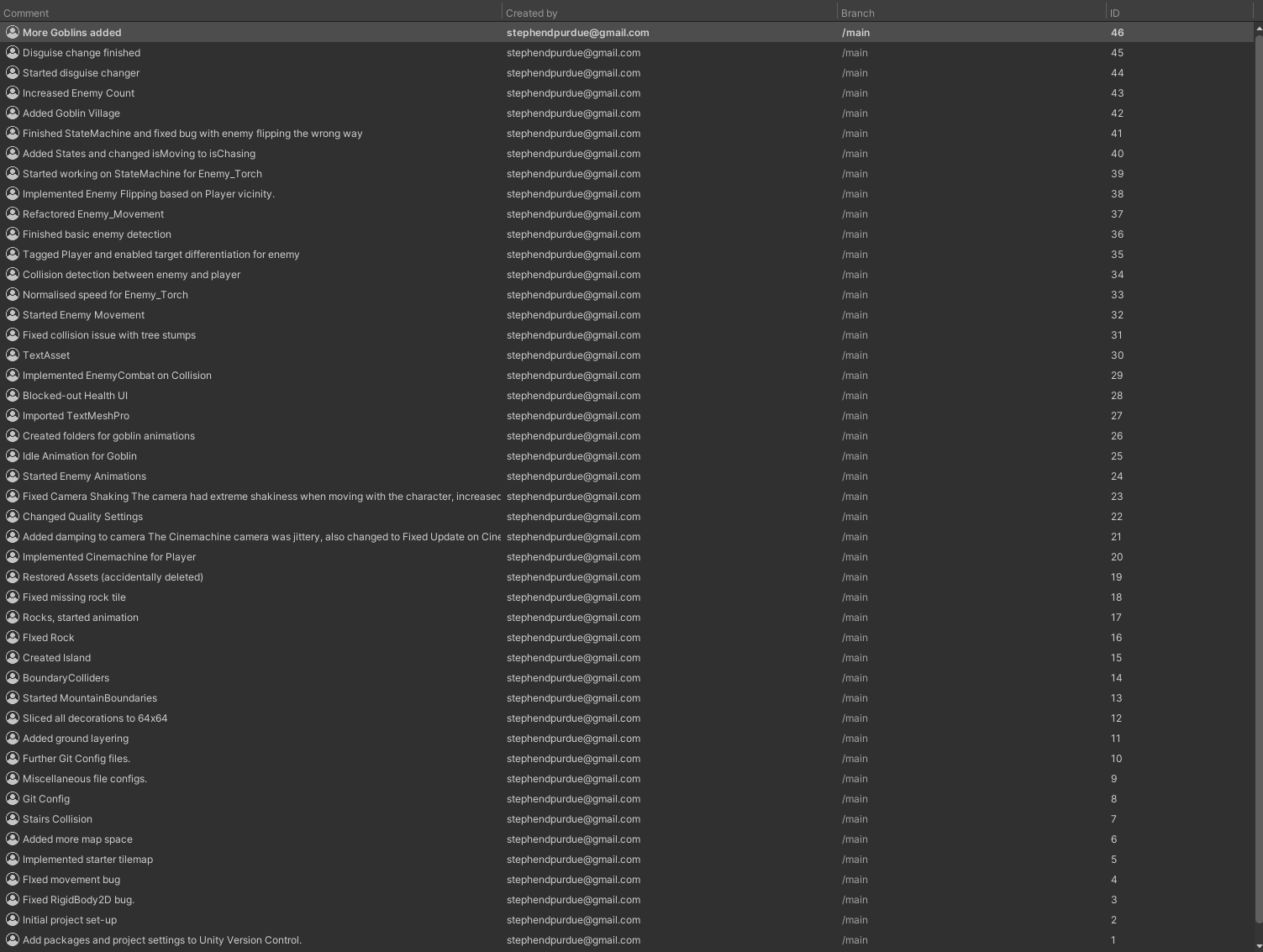 During Development, I used Unity Version Control to track and roll back changes. Should problems arise during the development cycle, more than 50 changes were logged, ranging from new systems to bug fixes. Documentation was kept within Unity, so detailed titles were used to outline changes.