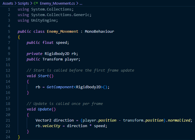 The AI detection system uses Unity's 2D trigger collision to create proximity-based chase behaviour. This favours simplicity over a more complex detection system. Each NPC possesses a CircleCollider2D trigger zone with a 4-meter radius outlining the detection range. When the player enters this area, OnTriggerEnter2D() executes, storing the player's transform reference and transitioning the NPC from Idle to Chasing via an enum-based state machine. During chase, FixedUpdate() calculates a direction vector from NPC to player and applies velocity to move towards the player. When starting, enemies were too fast and could outrun the player, causing an unfair scenario. Learning from this, I chose to set the default speed as 4 per second, so that the enemy is challenging, yet could be outrun. The NPC's sprite automatically flips based on the player's position to prevent it from facing the wrong direction. The initial attempts at creating this component were challenging and resulted in inverted flip logic, as each attempt at adding a new component to the script would cause it to start flipping to the wrong direction. This was fixed by hard-coding values so that it is facing either 1 or -1.