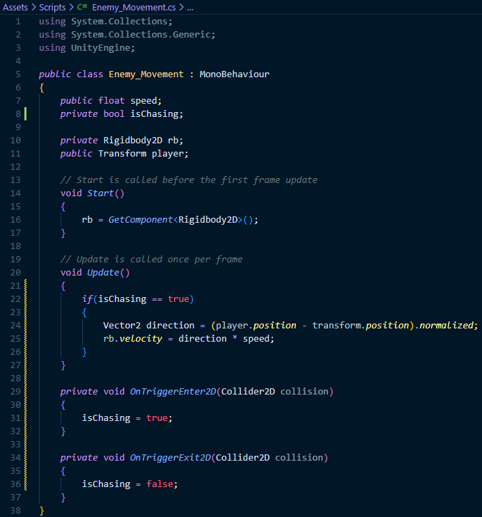 When the player exits the detection zone, OnTriggerExit2D() reduces the NPC's velocity to zero, clearing the player reference and returning to an Idle state. This is managed by Unity's animator component, with the ChangeState() method managing the animation boolean values: isIdle & isChasing. The isTrigger based approach provides clear detection for enemies, allowing them to remain idle or chase based on player proximity. When testing this system, the initial detection range was reduced from 7 to 4, as it was a bit too sensitive and would sometimes detect players before they were even on-screen.