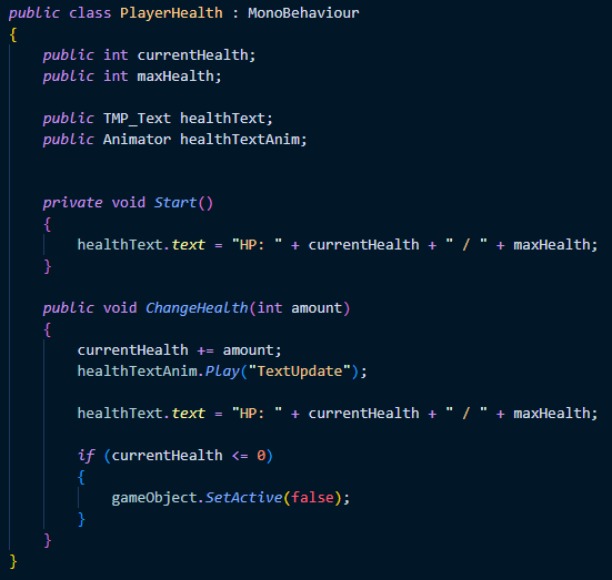 To start, a RigidBody2D was added to the Enemy_Torch so that damage could be added on contact. In Player_Health, two variables were used to decide maxHealth and currentHealth; these were then called in a public variable called ChangeHealth, which detected any damage and changed health accordingly. It also set the Player GameObject to false when health reached 0. Enemy_Combat was extremely simple, declaring a public integer for damage and setting it to 1, and changing the collided player's health by -1 upon impact.
