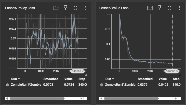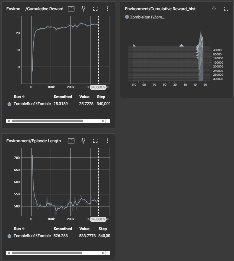 Training completed after around 320,000 steps, with cumulative reward rising from zero to 25.68 and stabilising around 50,000 steps. The value loss decreased over time from 0.15 to 0.035, indicating that the agent developed increasingly accurate predictions of potential future rewards. Policy loss varied between 0.066 and 0.074 throughout training, suggesting that the neural network identified a stable strategy rather than resorting to the common forgetful characteristics of earlier reinforcement learning algorithms. These metrics demonstrate that the agent successfully learned to optimise for rewards and engaging gameplay.