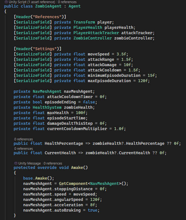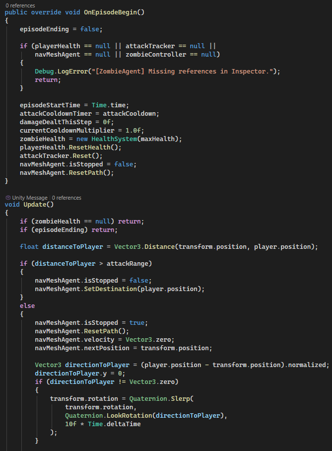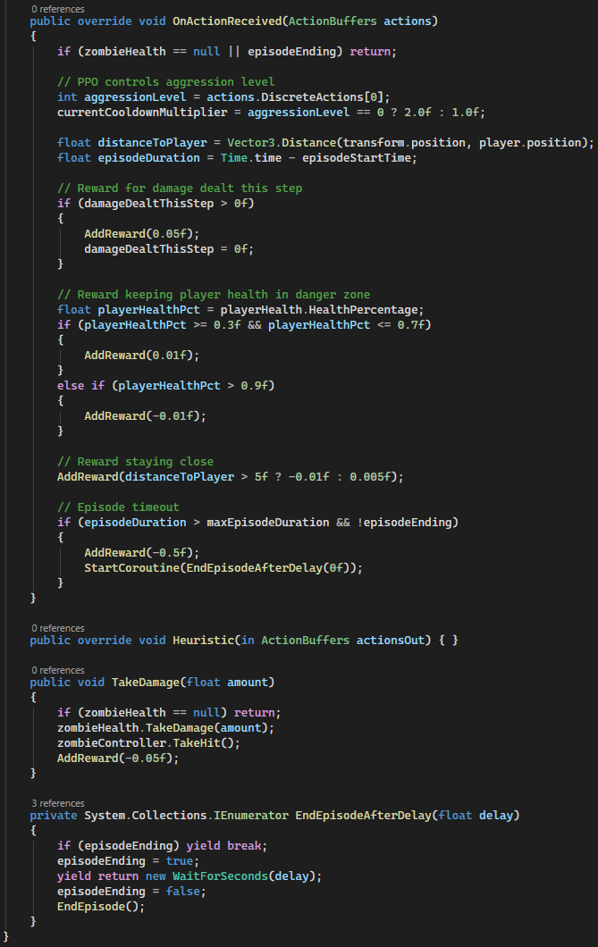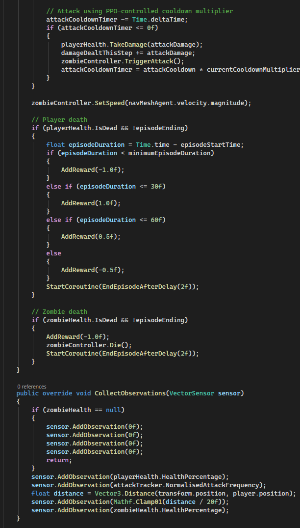 The ZombieAgent observes a 5-dimensional state vector at five key decision points: Player Health Percentage (0.0-1.0) tracked via the PlayerHealth components HealthSystem. Player Attack Frequency, (0.0-1.0) calculated through the PlayerAttackTracker monitoring for successful attacks over a rolling five-second window. Initially, a lower window of 3 seconds was used, but this proved overly aggressive against the boss. Distance to player (0.0-1.0) tracked against a 20-meter max range. Boss Health Percentage (0.0-1.0) tracked by the agent’s HealthSystem. Attack Cooldown (0.0-1.0) normalised against the 1.5-second cooldown period. This observation space was designed to operate within ZPD boundaries, with the player's health percentage directly affecting the challenge: high health signals to the agent that the difficulty is insufficient, while low health signals that it is intense. Attack frequency helps identify a player's offensive ability and engagement, allowing distance and cooldown decisions to be made accordingly. All observations are capped at the (0.0-1.0) range to ensure stable PPO updates during agent training.