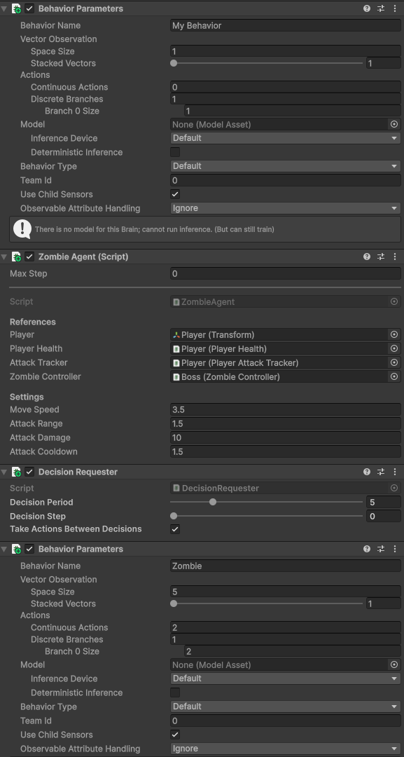 The ZombieAgent controls boss behaviour through a hybrid action space approach: two continuous action parameters controlling movement (moveX and moveZ, each with ranges of (-1.0, 1.0), and one discrete action with two branches (0 = no attack, 1 = attack). Continuous movement actions enable smooth navigation toward or away from the player, whereas discrete actions provide clear decision points for attacking. The ZombieController executes these actions, updating the animator based on movement, triggering an attack state when the discrete action fires within the attack range (1.5 metres) and outside the cooldown period (1.5 seconds).