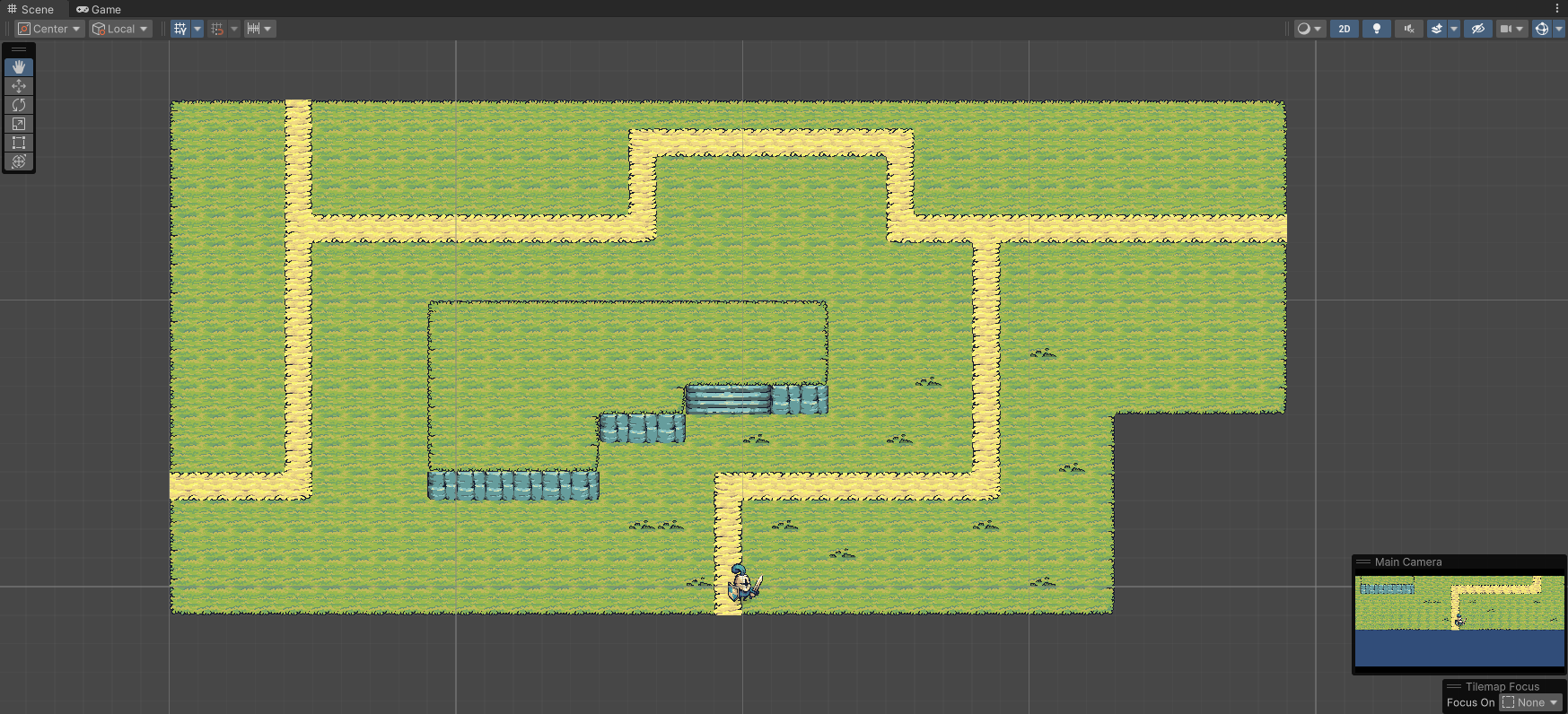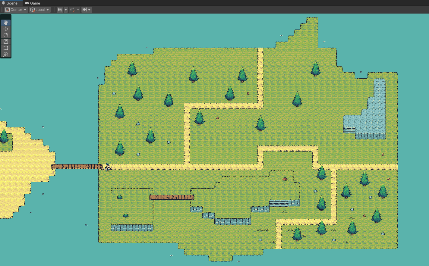 I chose to use Unity's tilemap system due to its simplicity and accessibility. Layers were created for Ground, Elevation, Interactive Objects, and Decorations, in order for collision to work correctly. The elevation was extremely simple, using a Tilemap Collider in order to detect player collision.